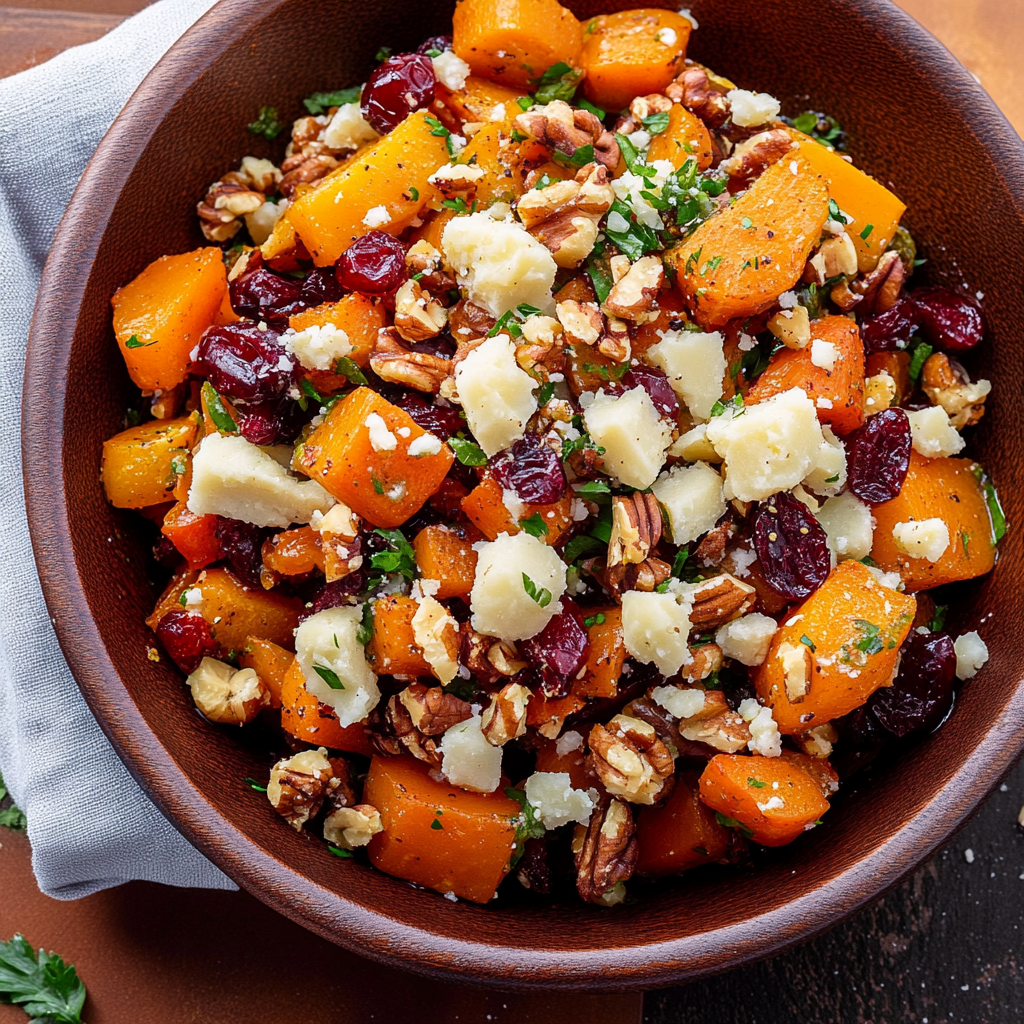 A delightful combination of savory roasted vegetables, tart cranberries, and crunchy maple-coated walnuts, perfect for fall gatherings.